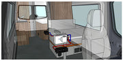 The compact Aqua-Hot 125 can be installed inside/under cabinetry or furniture. This highly efficient system operates as the van's heating system and continuous hot water supply. As many as 3 heat exchangers (black units in photo) can be placed throughout the van to bring heat where needed. The burner is installed on the underside of the van chassis for noise reduction and exhaust.